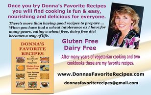 Donna resides in California and this is her third cookbook of fabulous vegetarian recipes. “ But there’s more than having good recipes to prepare … when you have had a gluten and lactose intolerance as I have for many years, eating a gluten free, dairy free diet becomes a way of life”. Donna’s Favorite Recipes is a cookbook created for people who enjoy great tasting meals but struggle with gluten and dairy intolerance in their diet. My Mom, brother, grand-daughter and best friend all have sensitivities to wheat, dairy or both. So I created recipes that would assure us of healthy, tasty, wholesome, enjoyable meals. My gluten free and dairy free recipes address these digestive problems but are tasty enough for everyone in the family. After many years of vegetarian cooking, these are my favorite recipes. Cooking with Donna’s Favorite Recipes is fun and easy! It is full of colored photographs of the meals and the large print makes it easy to read. Try Donna’s Favorite Recipes for your good health & happiness! Donna